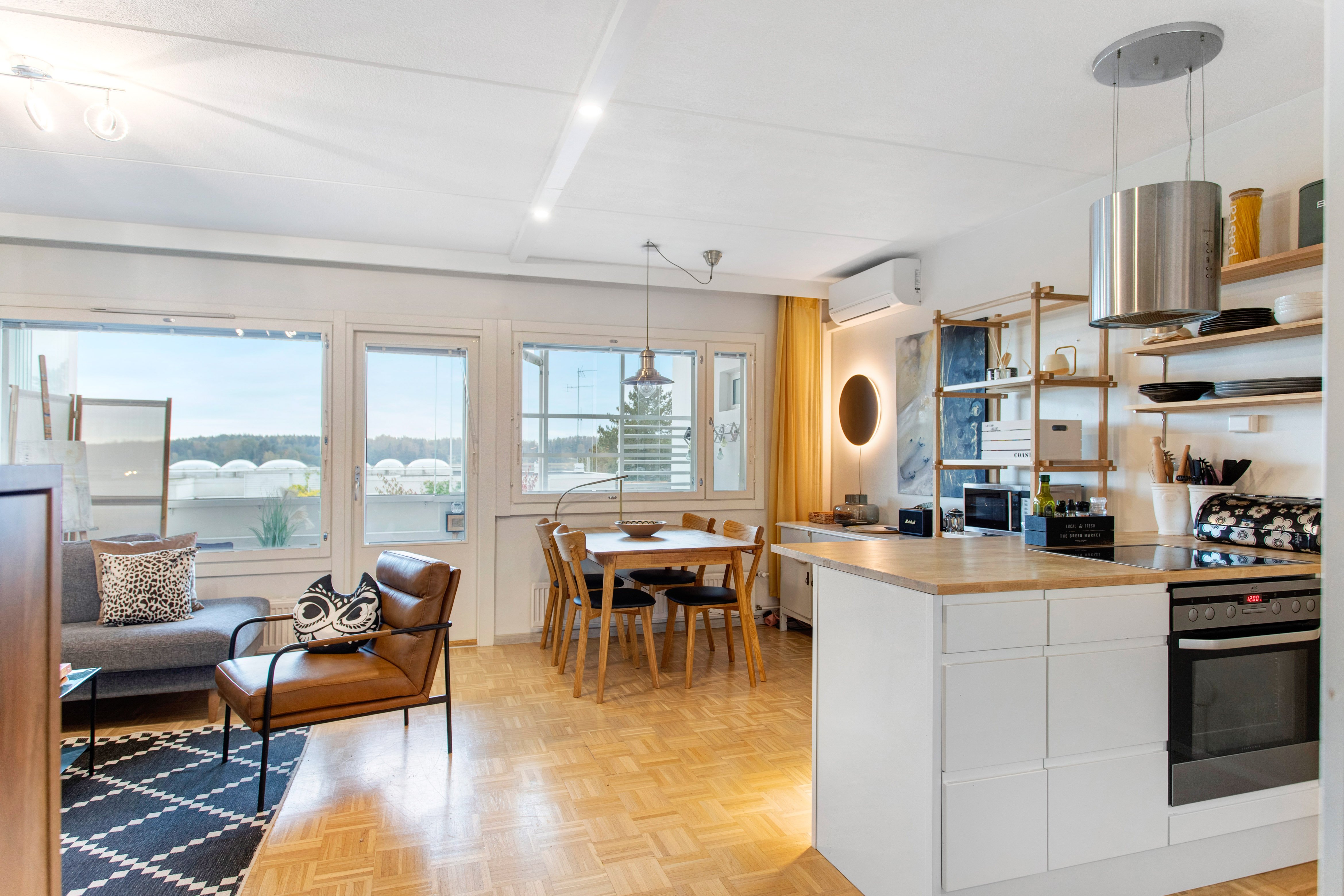 Upea läpitalon kolmio rantaraitin tuntumassa isolla lasitetulla terassiparvekeella mitä parhaimmalla sijainnilla. Metroasema, bussiyhteydet ja palvelut ovat kävelymatkan päässä. Täällä nautit rauhallisesta ympäristöstä rantaraitteineen ja hiekkarantoineen. Huoneistosta näkymät myös merelle.