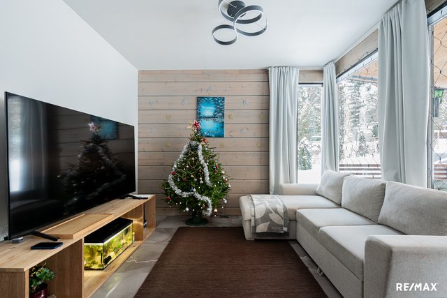 - Olohuoneessa lattiassa laatta ja seinissä hirsipinta. Olohuoneessa tilan tuntua tuo isot ikkunat.