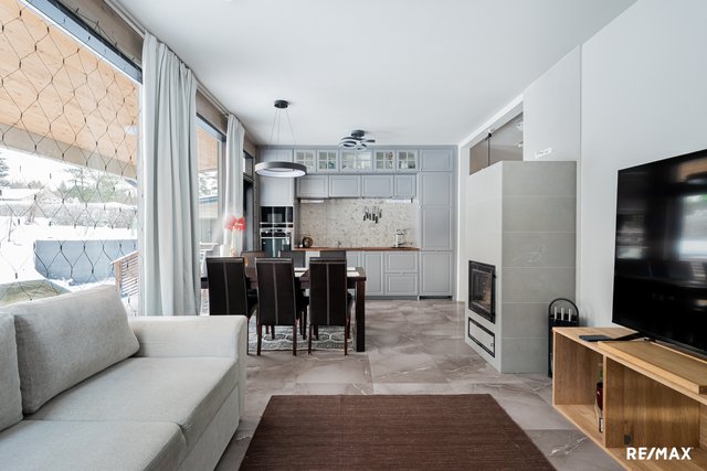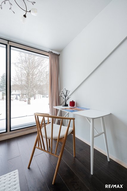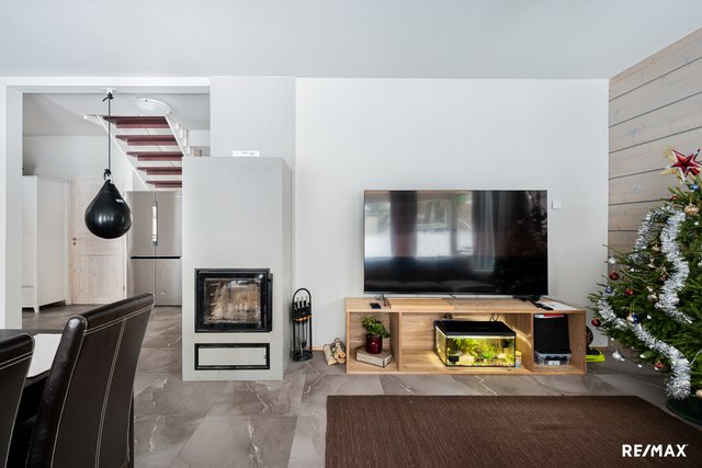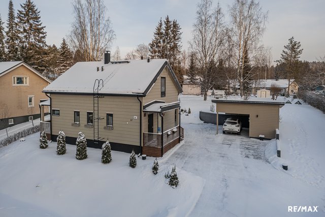 Olohuoneen ja avokeittiön muodostama yhtenäinen tila avautuu kauniisti terassille ja piha-alueelle, ja varaava takka tuo sekä tunnelmaa että lisälämpöä. Asuintilat sijoittuvat kahteen kerrokseen, ja kolme makuuhuonetta tarjoavat joustavat puitteet perheelle tai etätyöhön.