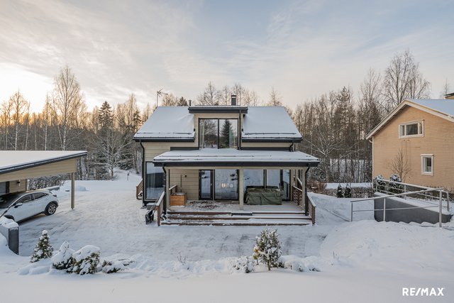 Kodikas ja moderni vuonna 2023 valmistunut Kontion hirsitalo rauhallisella Soltin pientaloalueella.