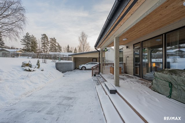 Arkea helpottavat kaksi wc:tä, erillinen kodinhoitohuone omalla uloskäynnillä sekä runsaasti säilytystilaa. Lämmitysmuotona on helppo kaukolämpö vesikiertoisella lattialämmityksellä, ja energialuokka B tukee maltillisia asumiskustannuksia. Oma 657 m² tontti, autokatos ja huolella viimeistellyt materiaalit viimeistelevät kokonaisuuden.