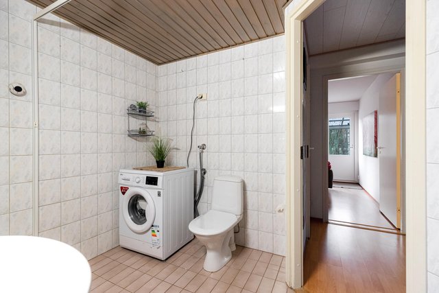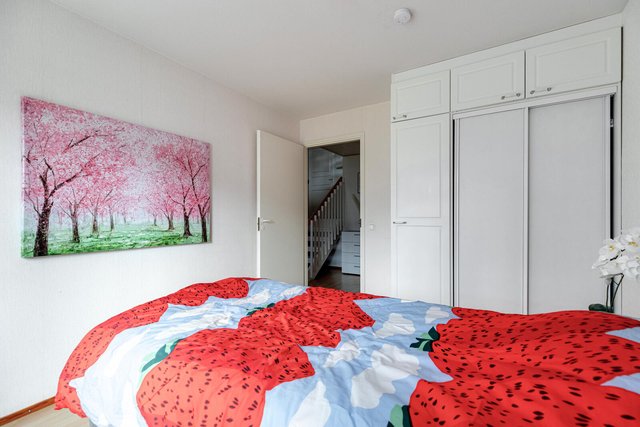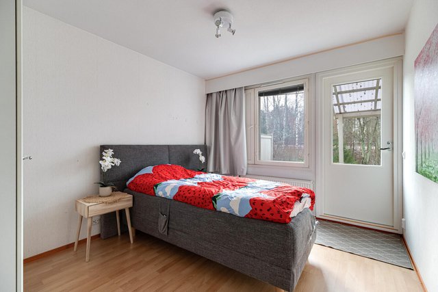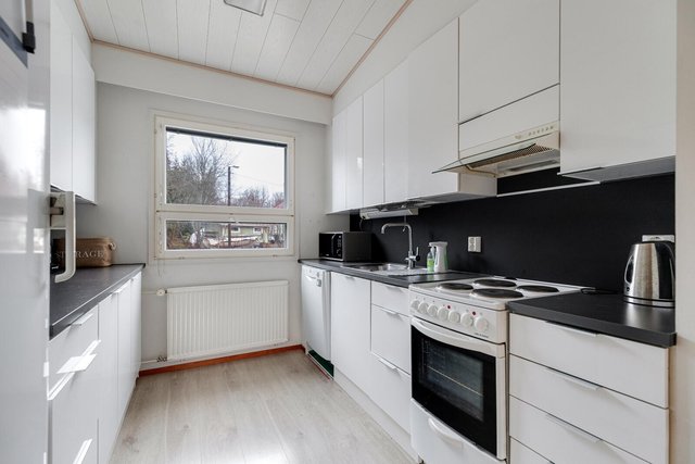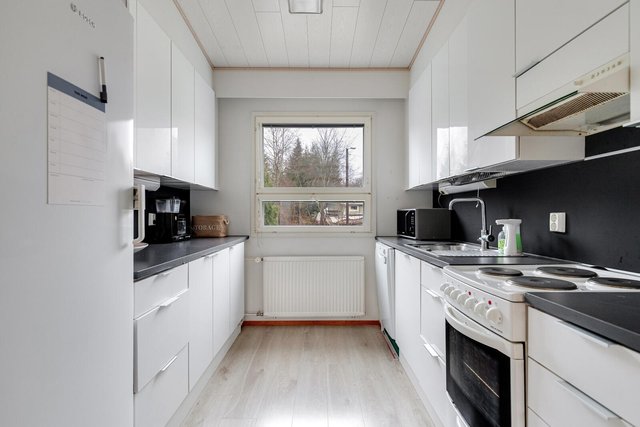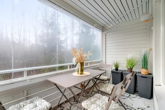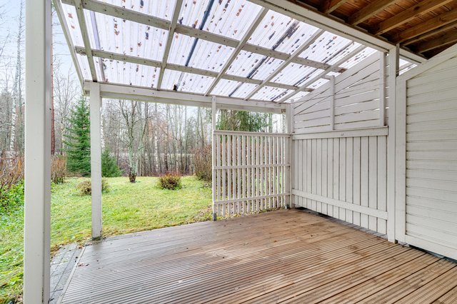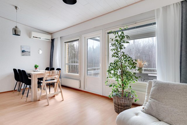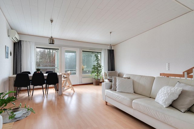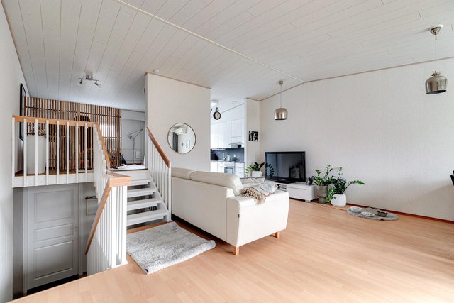 Asunnon lounaaseen suuntautuva lasitettu parveke ja oma terassi tarjoavat mukavat puitteet kahdessa kerroksessa. Vuonna 2002 valmistunut asunto on hyvässä kunnossa ja siinä on tilavat 90 neliömetriä, jotka sisältävät kaksi makuuhuonetta olohuoneen, keittiön, saunan sekä parven. Lämmitysjärjestelmänä toimii kaukolämpö ja koneellinen ilmanvaihto, joka takaa raikkaan sisäilman. Asuntoon kuuluu myös lämmin autotalli ja kylmä ulkovarasto sekä pihapaikka kakkosautolle.
