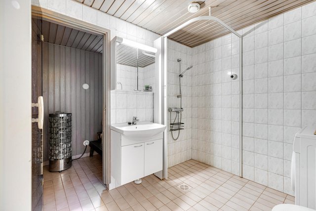 - Suihku, suihkuseinä, lattialämmitys, peilikaappi, pesuallas, allaskaappi, ja wc-istuin