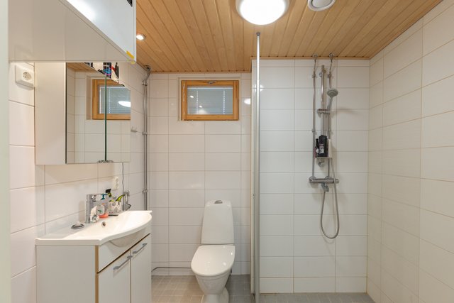 - WC-istuin, suihku, pesukoneliitäntä, allaskaappi, bidee-suihku, peilikaappi, lattialämmitys, ja suihkuseinä