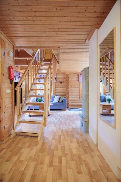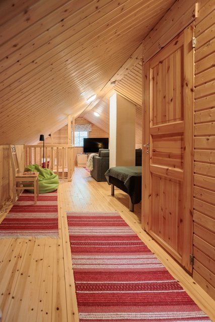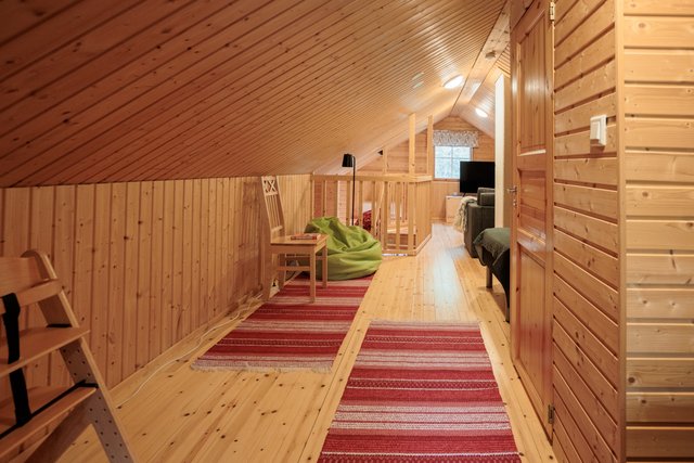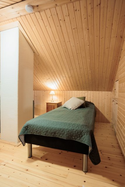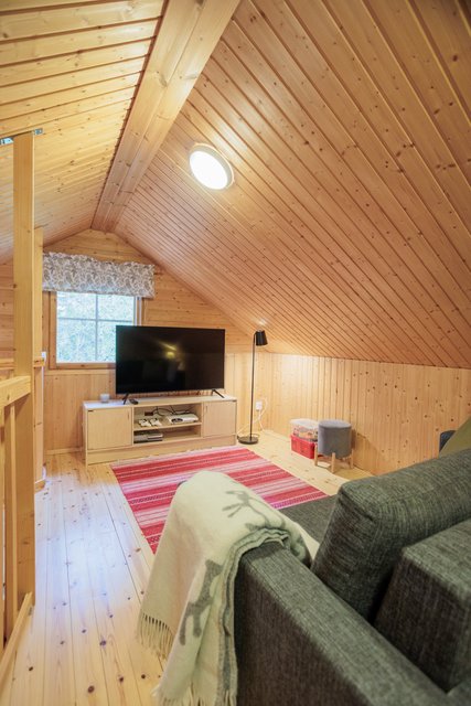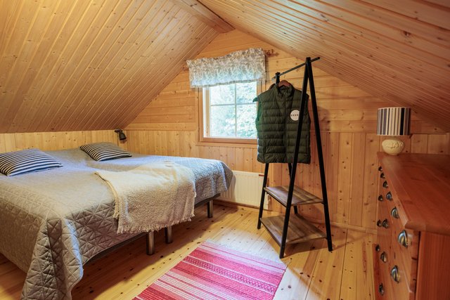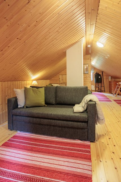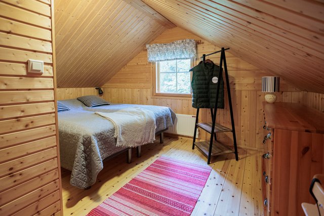 Lämpimän sävyinen makuuhuone sijaitsee alakerrassa, ja yläkerran parvella on reilusti lisätilaa majoittua. Yläkerta tarjoaa rauhallisen lepopaikan yhdellä erillisellä makuuhuoneella sekä mahdollisuuden lisäsänkyjen tai vuodesohvan käyttöön, jos tarvitset enemmän majoitustilaa.