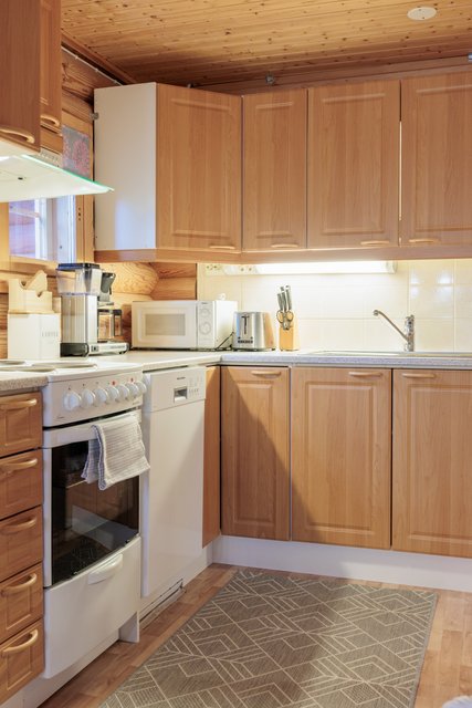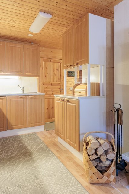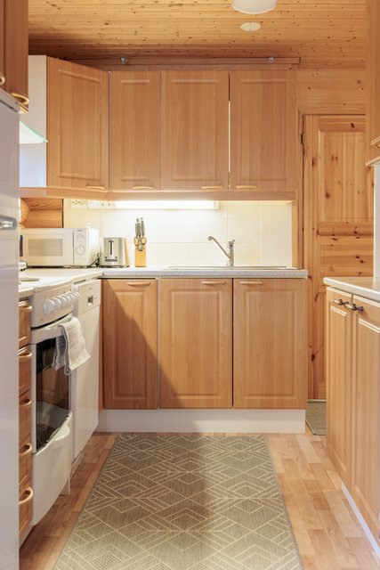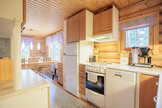 - Tässä mökissä on mukavan käytännöllinen keittiö, jossa lomakokki loihtii helposti herkulliset appeet isommallekin lomaseurueelle. Lasku- sekä kaappitilaa on riittävästi.