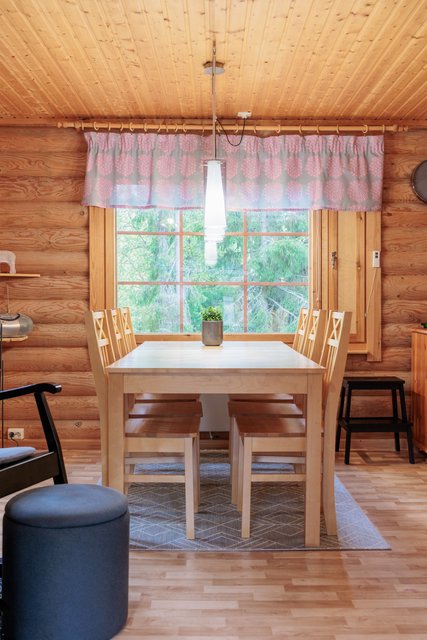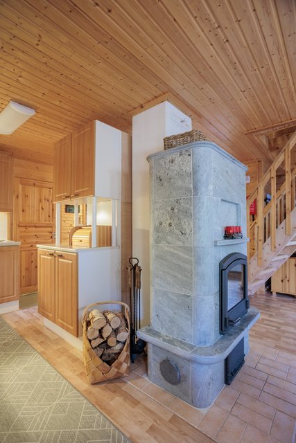 - Olohuone ja ruokailutila muodostavat kauniin ja tunnelmallisen oleskelutilan, jossa suurempikin seurue mahtuu mainiosti viettämään yhteistä aikaa. Kaiken keskellä on upea, varaava vuolukivitakka, joka tuo lämpöä sekä tunnelmaa pimeisiin talvi-iltoihin.