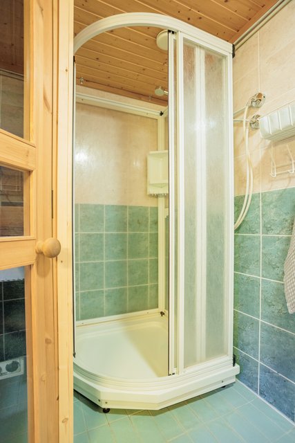 - Alakerrasta löytyy pesutila - sauna - wc yhdistelmä, jossa onkin oikein mukavan väljät tilat. Täältä löytyy mökin toinen wc, jossa on myös allasvarustus. Suihkutilaan on laitettu suihkukaappi, joten itse pesutila pysyy kuivana ja siistinä kuin itsestään.