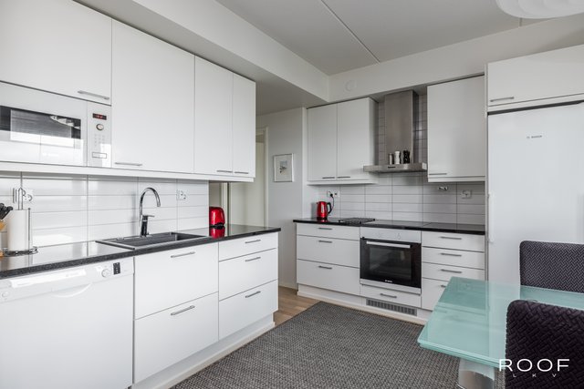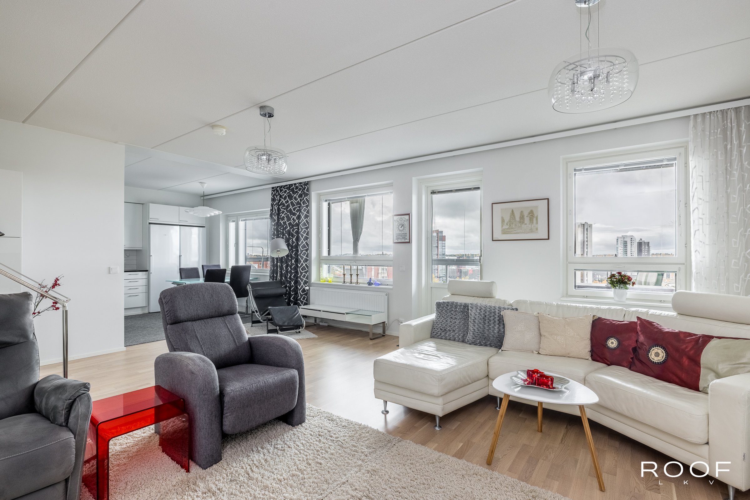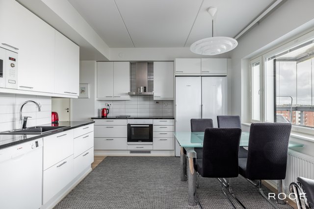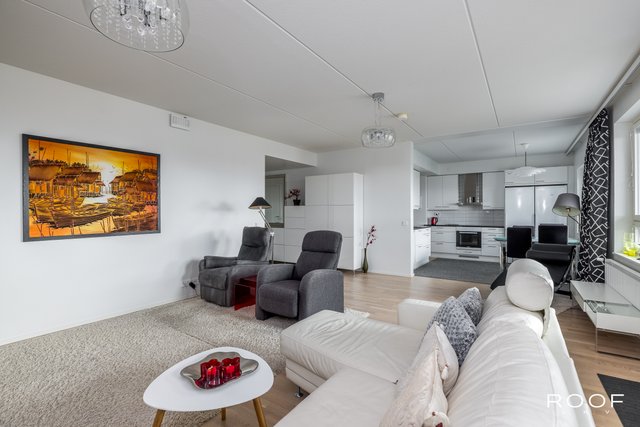 Tämä avara kolmio sijaitsee taloyhtiön 7. kerroksessa. Huoneistossa on kaksi reilun kokoista makuuhuonetta ja mahdollisuus kolmannelle huoneelle. Avokeittiö, johon on tehty muutoistöitä rakennusvaiheessa, mm kaapistot, laajennus sekä kivitaso. Keittiö yhdistyy luonnollisesti oleskelutilaan, josta on käynti poikkeuksellisen suurelle n. 22m2 lasitetulle parvekkeelle. Parvekkeelta aukeaa uskomattomat näkymät etelään/lounaaseen. Huoneistossa on kaksi kylpyhuonetta, joista toisessa kodinhoidolle hyvin tilaa ja toisessa oma sauna. Hissillä pääset suoraan sisäkautta parkkihalliin, josta myydään sähköautonlatauspisteellä varustettu autopaikka erikseen.
