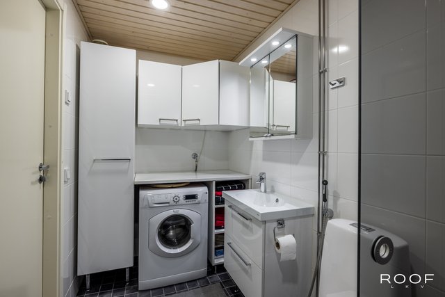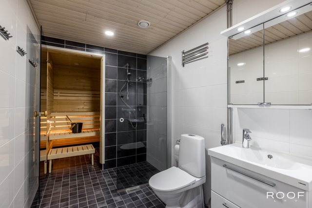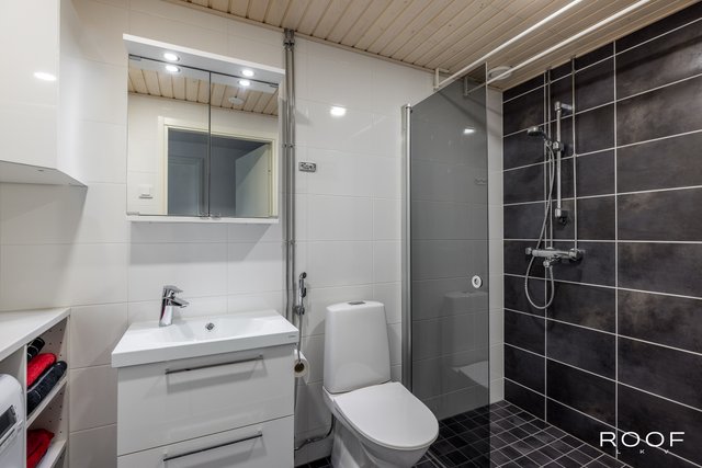 - WC-istuin, suihku, suihkuseinä, pesukoneliitäntä, peilikaappi, lattialämmitys, pesuallas, allaskaappi, bidee-suihku, ja erillinen kaapisto