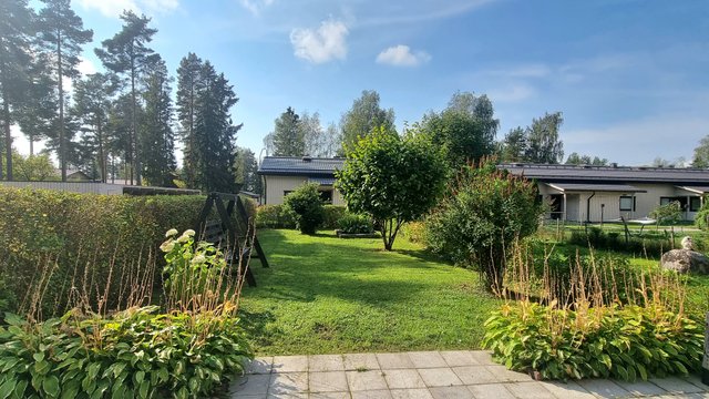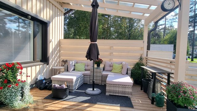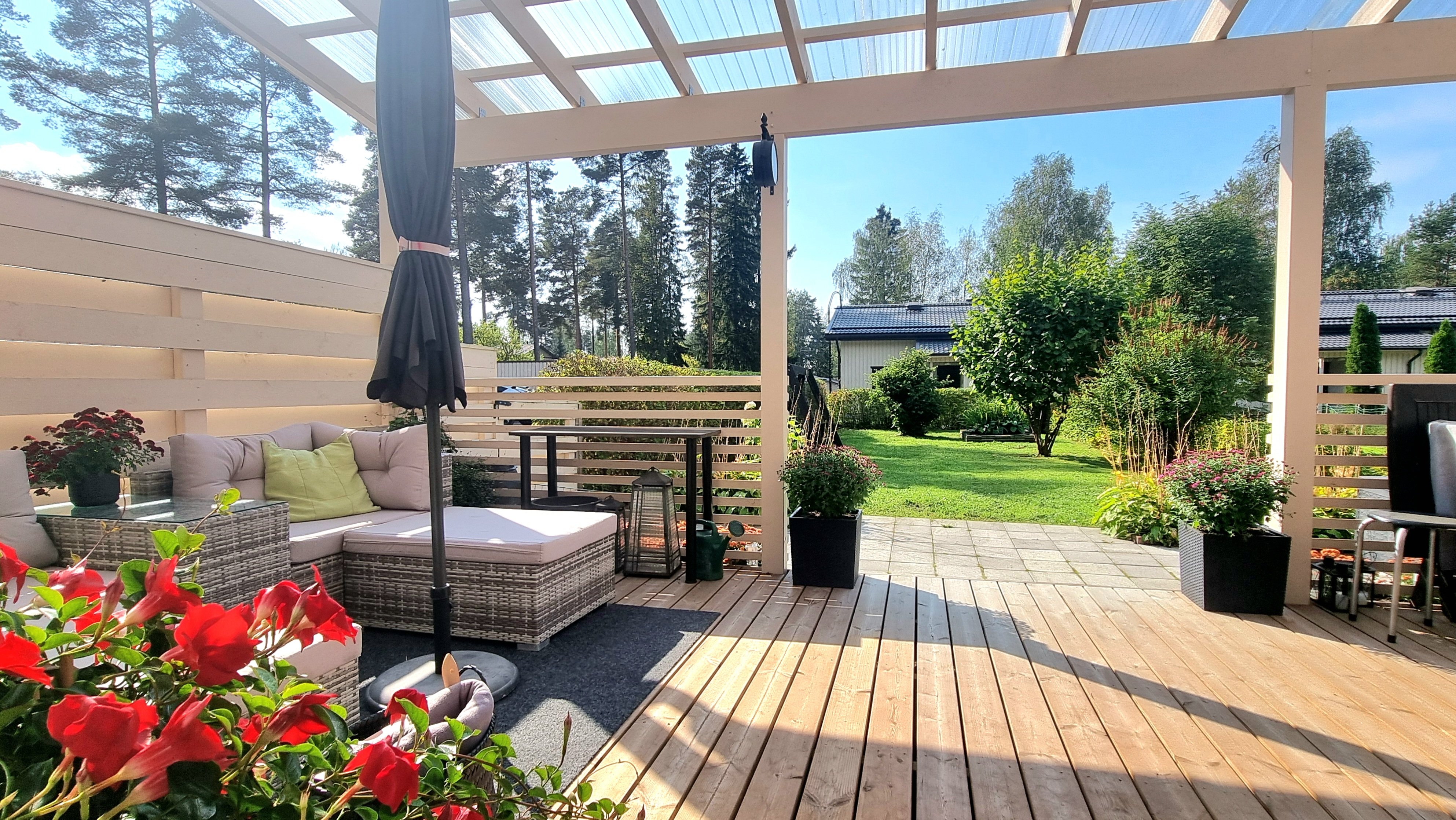 - Olohuoneesta käynti isolle takapihalle, jossa on myös iso katettu terassi.