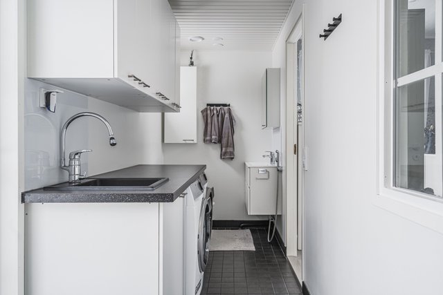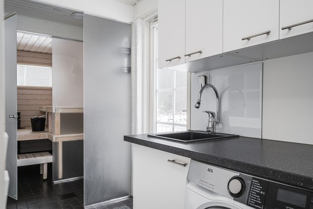 - Pesukoneliitäntä, pyykkikaapit, lattialämmitys, pöytätaso, wc, bidee, ja pesuallas