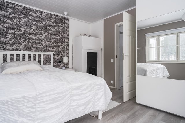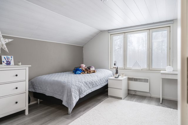 Yläkerrassa sijaitsevat kaksi makuuhuonetta, joista toinen on vielä hieman keskeneräinen.