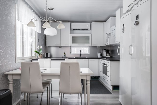 - Jääkaappi, erillinen pakastin, astianpesukone, liesi, keittiösaareke, ja uuni