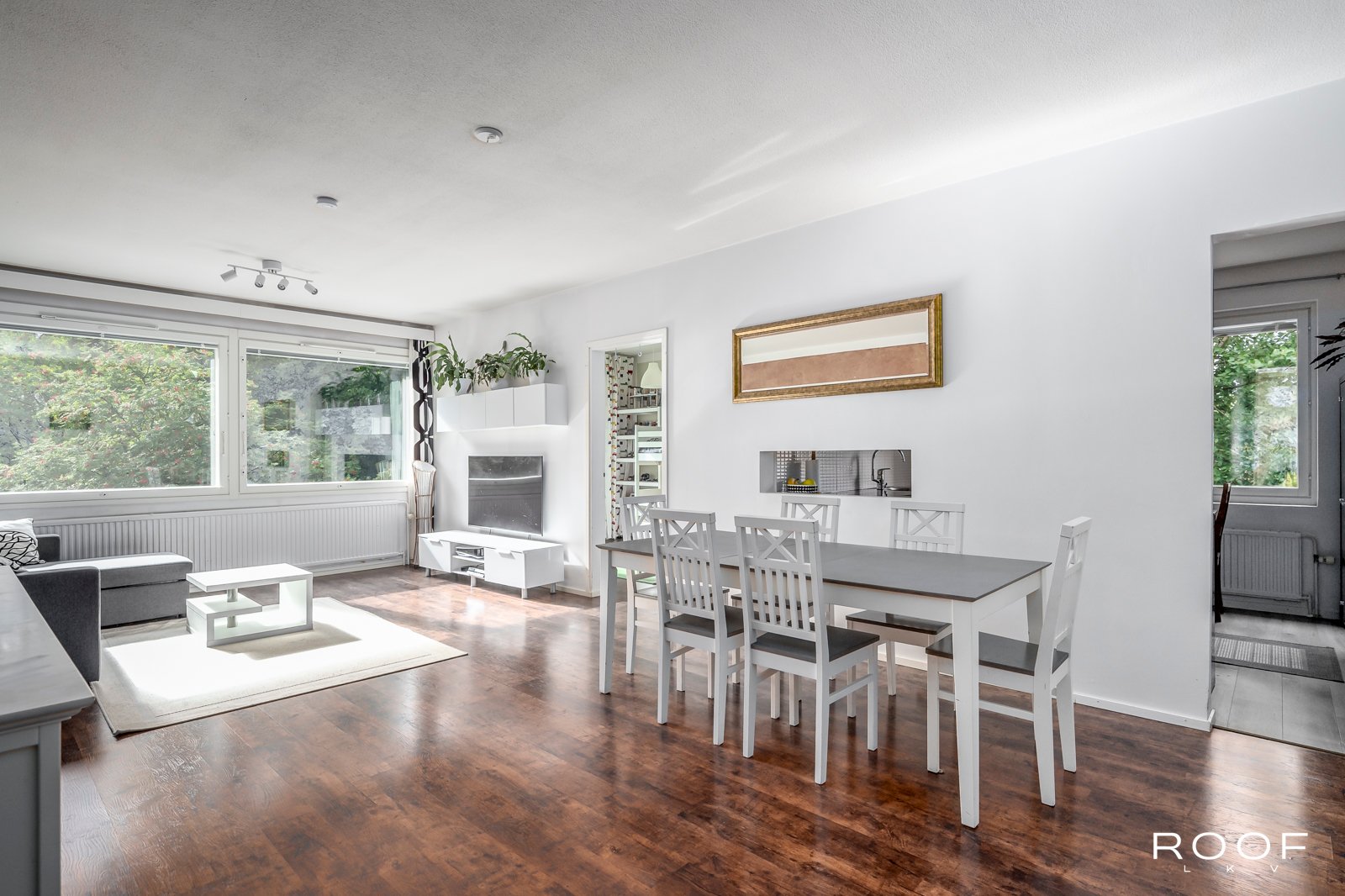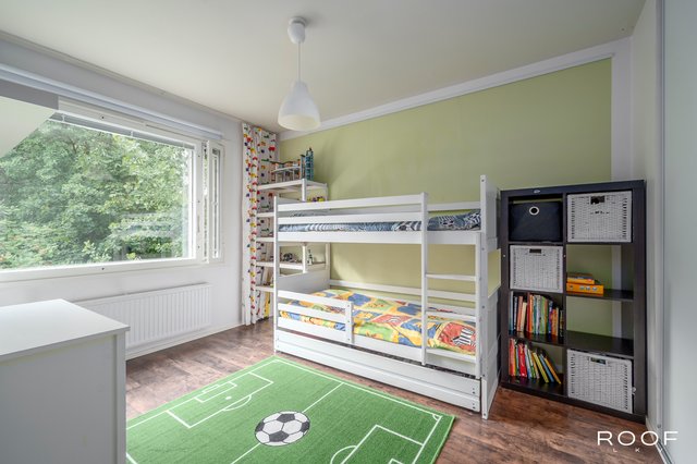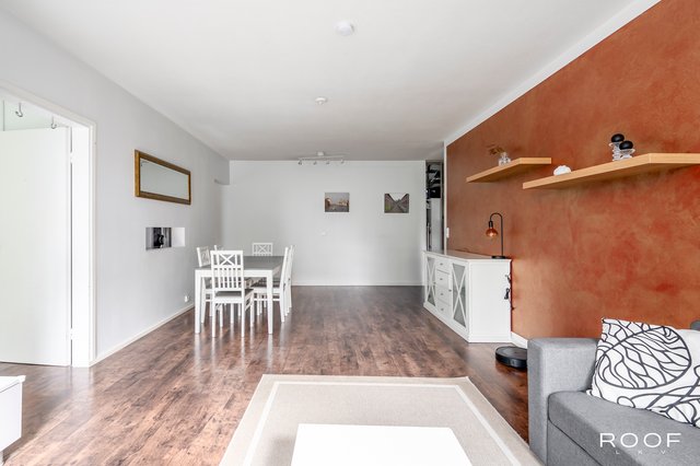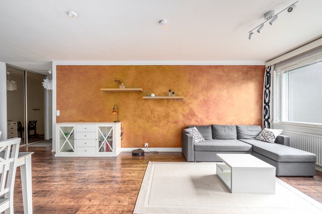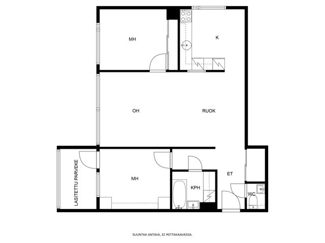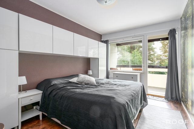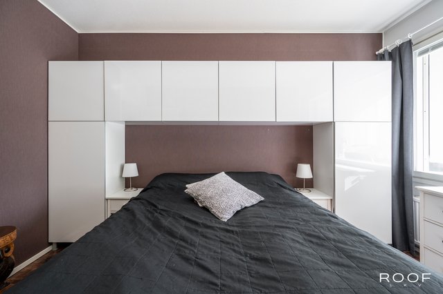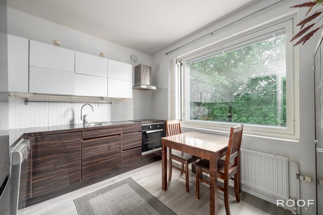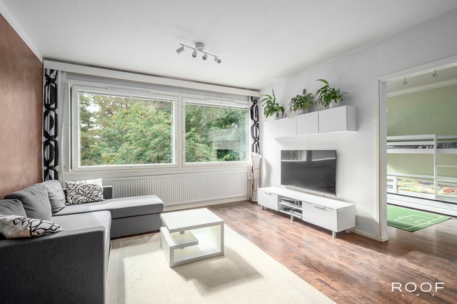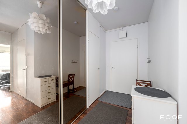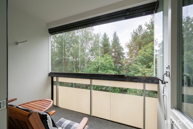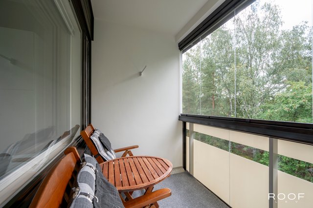 Valoisa ja tilava olohuone tarjoaa runsaasti tilaa niin oleskeluun kuin ruokailuun. Ruokailutila sijaitsee olohuoneen yhteydessä, mutta keittiö jää kätevästi syvennykseen, tarjoten rauhaa ruoanvalmistukseen. Keittiö on käytännöllinen ja tarjoaa mukavasti sekä kaappi- että työskentelytilaa. Molemmissa makuuhuoneissa on valmiiksi säilytystilaa, joka helpottaa arkea. Tilava kylpyhuone, erillinen wc ja käytännöllinen eteinen tekevät asumisesta mukavaa ja sujuvaa. Lasitettu parveke tuo lisätilaa ja viihtyisyyttä, täydentäen tämän harmonisen kokonaisuuden.