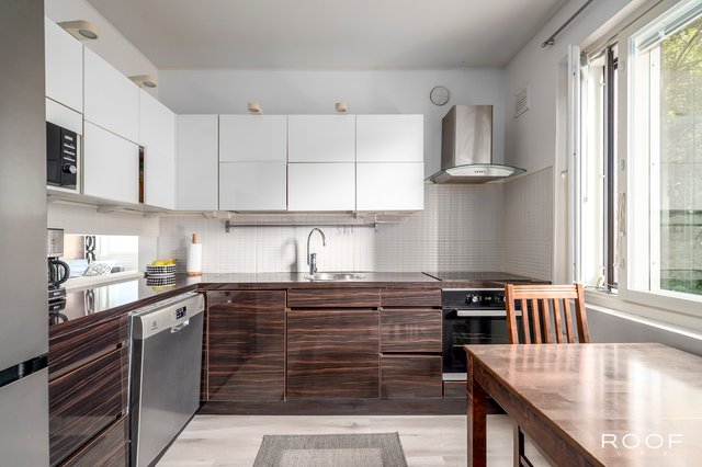 - Varustus: Induktioliesi, Liesituuletin, Uuni, Hana, Kaapisto, Allas, Astianpesukone, Jääkaappipakastin Seinämateriaali: Maali Lattiamateriaali: Laminaatti
