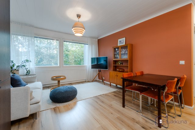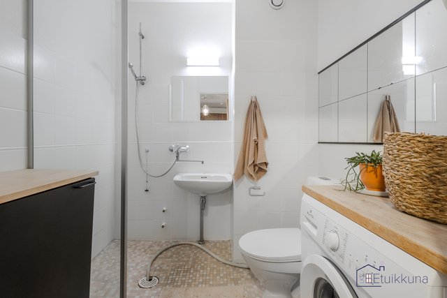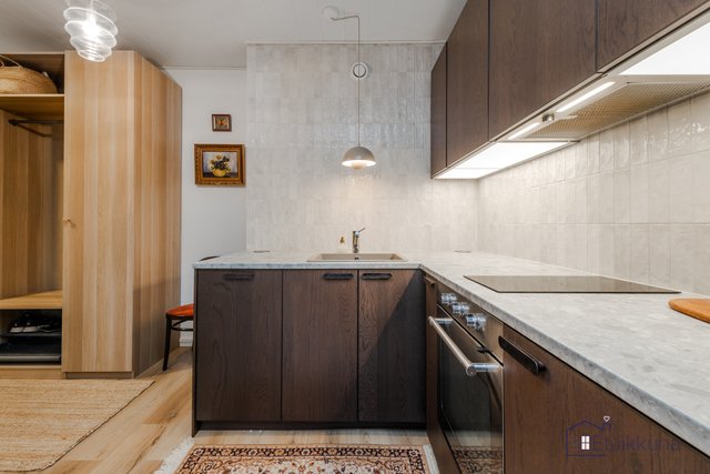 - Tyylikäs ja toiminnallinen avokeittiö remontoitiin kokonaisuutena vuonna 2023. Keittiössä on runsaasti työskentely- ja laskutilaa, jota entisestään lisää poikkeuksellisen syvä työtaso vesipisteen puolella. Tummat kaapinovet ja vaalea kaunis välitilalaatta antavat kauniin kontrastin muuten vaaleaan tilaan. Keittiö muodostaa sopuisan kokonaisuuden yhdessä olohuoneen kanssa. Tilaan mahtuu erinomaisesti neljän tai kuudenkin hengen ruokaryhmä. Keittiön varustuksena on jääkaappipakastin (no frost), kahden levyn keraaminen liesitaso, kiertoilmauuni, astianpesukone ja liesituuletin (aktiivihiili). Mikroaaltouunille on paikka jääkaapin viereisessä yläkaapissa.