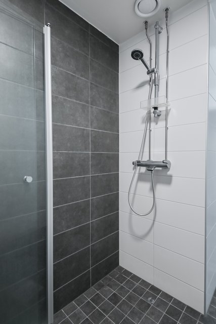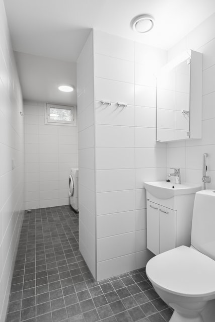 - WC-istuin, suihku, suihkuseinä, lattialämmitys, pesukoneliitäntä, pesuallas, peilikaappi, allaskaappi, ja bidee-suihku