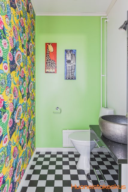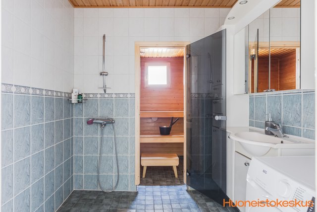 - WC-istuin, pesukoneliitäntä, allaskaappi, suihku, ja lattialämmitys