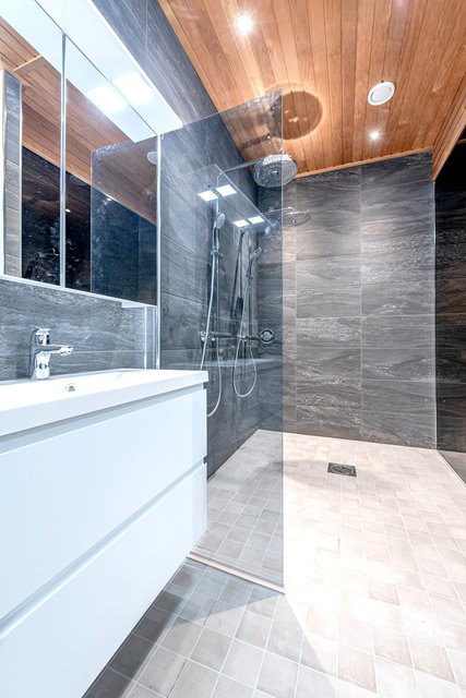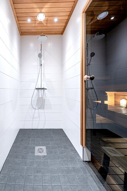 - Lattialämmitys, wc-istuin, suihku, allaskaappi, peilikaappi, ja kiinteät valaisimet