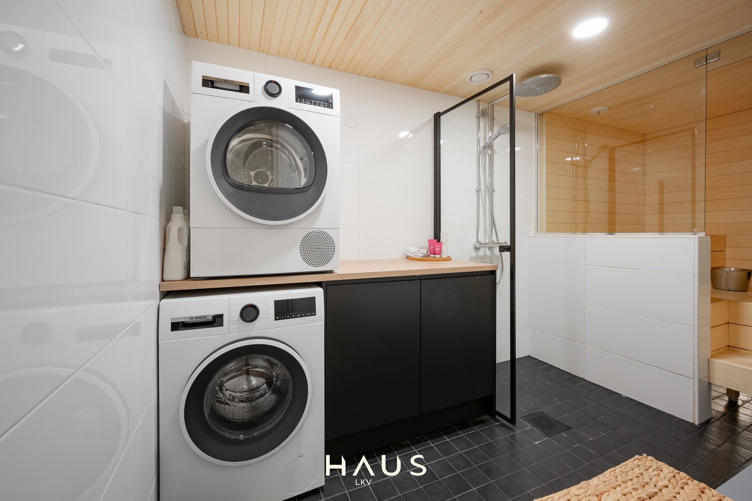 - Suihku, suihkuseinä, pesukoneliitäntä, ja lattialämmitys