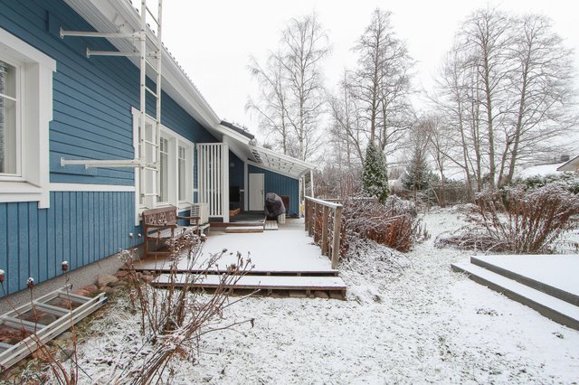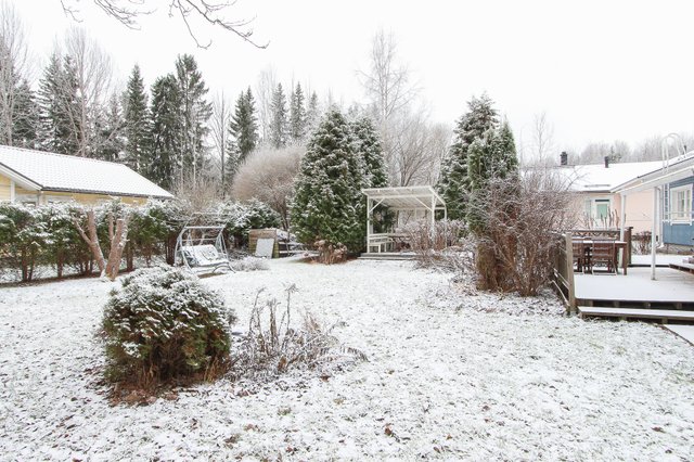 Vehreä ja tasainen piha on todellinen puutarhaihmisen unelma – siellä kasvaa jopa 36 eri kasvilajia. Terassi ja katettu pergola tarjoavat upeat puitteet rentoon oleskeluun ja kesäpäivien viettoon.