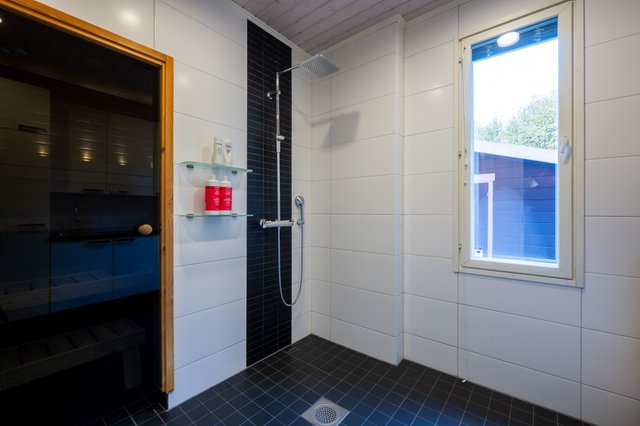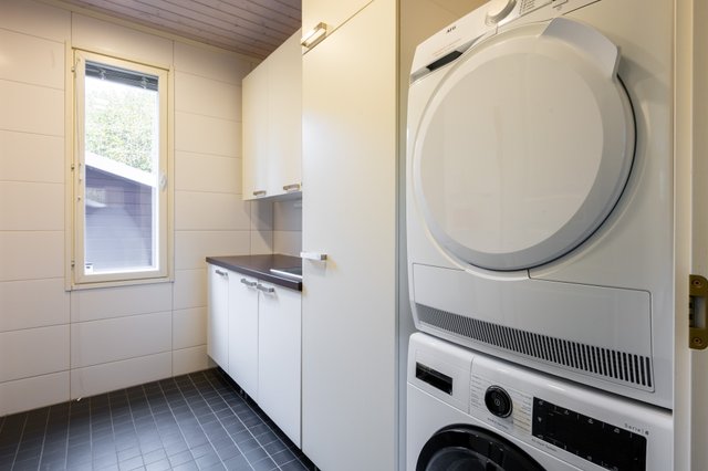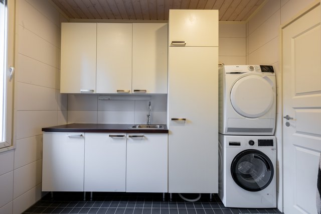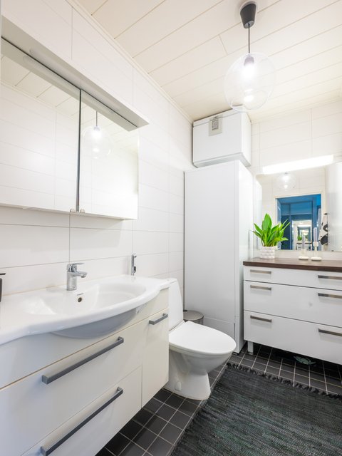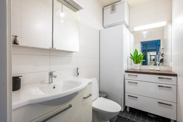 - Suihku, pesukoneliitäntä, lattialämmitys, ja allaskaappi