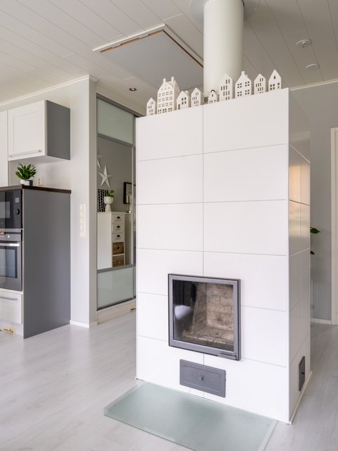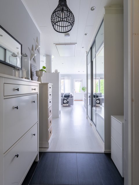 - Eteisen peilikaapissa keskuspölynimurin säiliö. Keittiössä ja peilikaapin lattiatasossa imureikä, johon roskat voi esimerkiksi jalalla työntää.