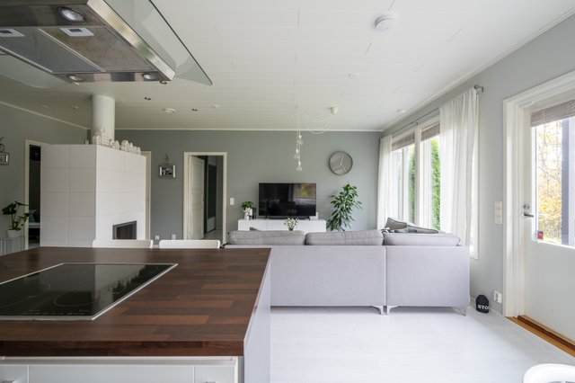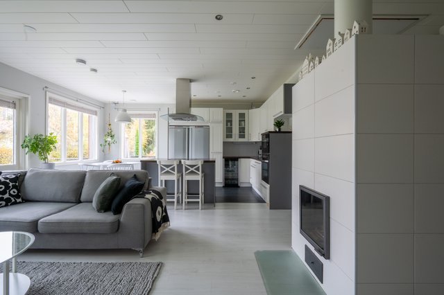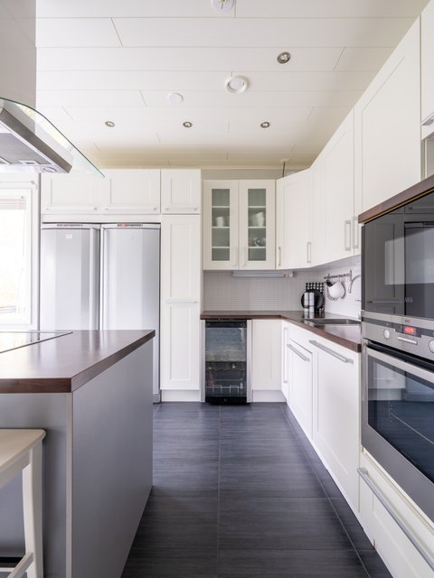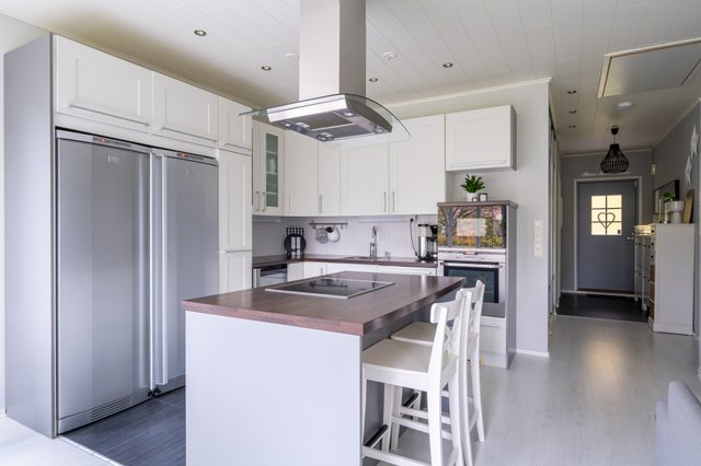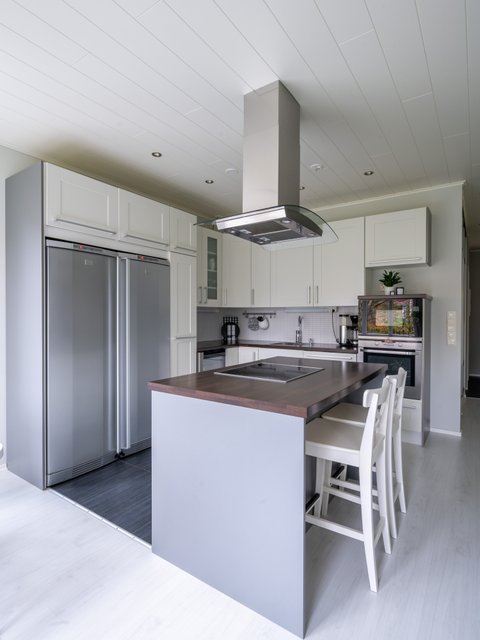 - Jääkaappi, erillinen pakastin, erillisuuni, mikroaaltouuni, liesi, liesituuletin, astianpesukone, keittiösaareke, ja viinikaappi