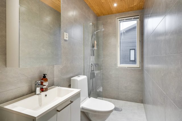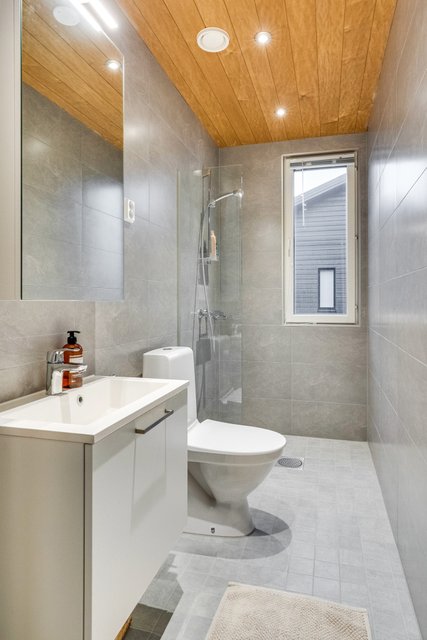 - Yläkerran erillinen wc helpottaa kiireistä arkea. Yläkerran wc on varusteltu suihkulla. Lattia: laatta Seinät: kaakeli