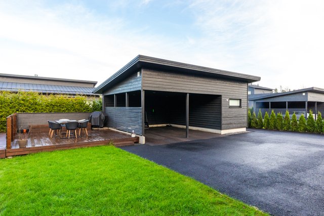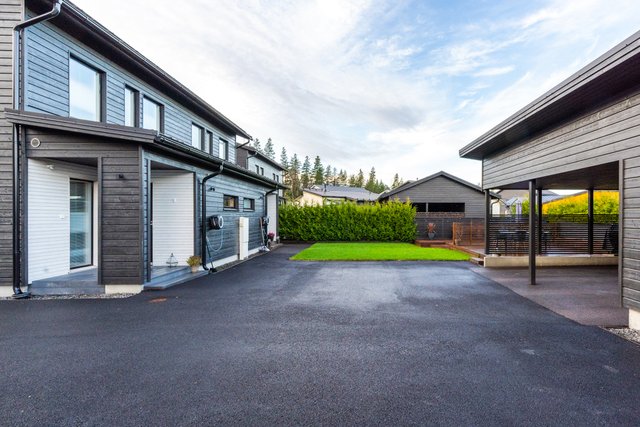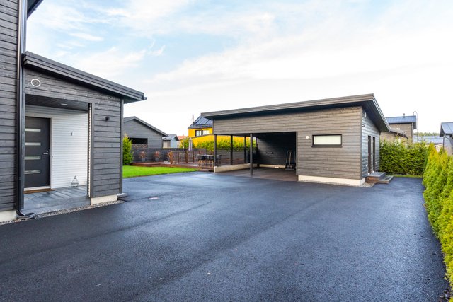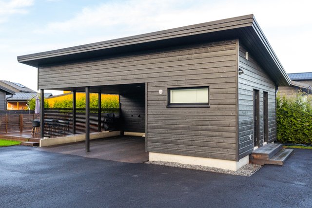 - Autokatosrakennuksessa kummallekin asunnolle katospaikka ja lämmin ulkovarasto. Asunnolla on kaksi autopaikkaa, joista toinen on autokatoksessa sähköauton latausmahdollisuudella ja toinen on kylmä pihapaikka. Lisäksi huoneiston etupihalla on terassi. Terassi ja autopaikat ovat merkattu hallinnanjakosopimukseen.