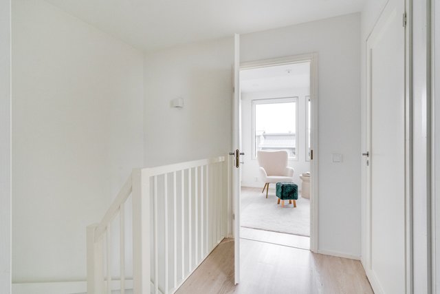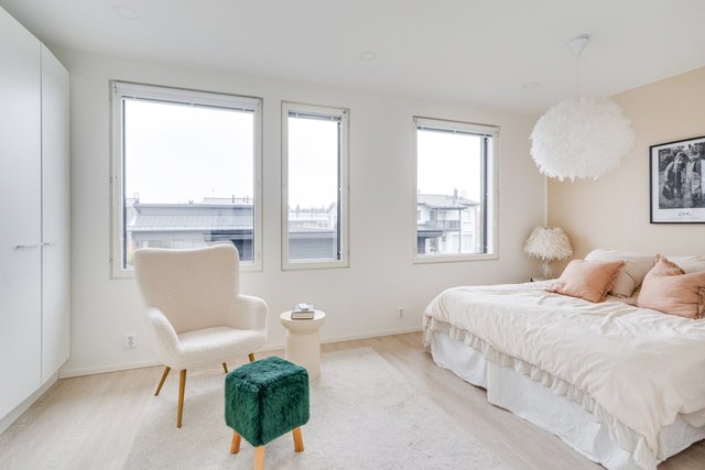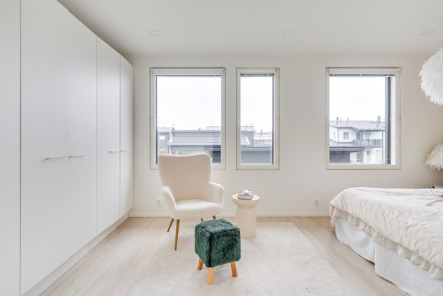 Yläkerrasta löytyy master bedroom sekä kaksi pienempää makuuhuonetta. Yhdestä makuuhuoneesta on käynti lasitetulle parvekkeelle. Yläkerrasta löytyy myös arvostettu erillinen wc, joka helpottaa kiireistä arkea.