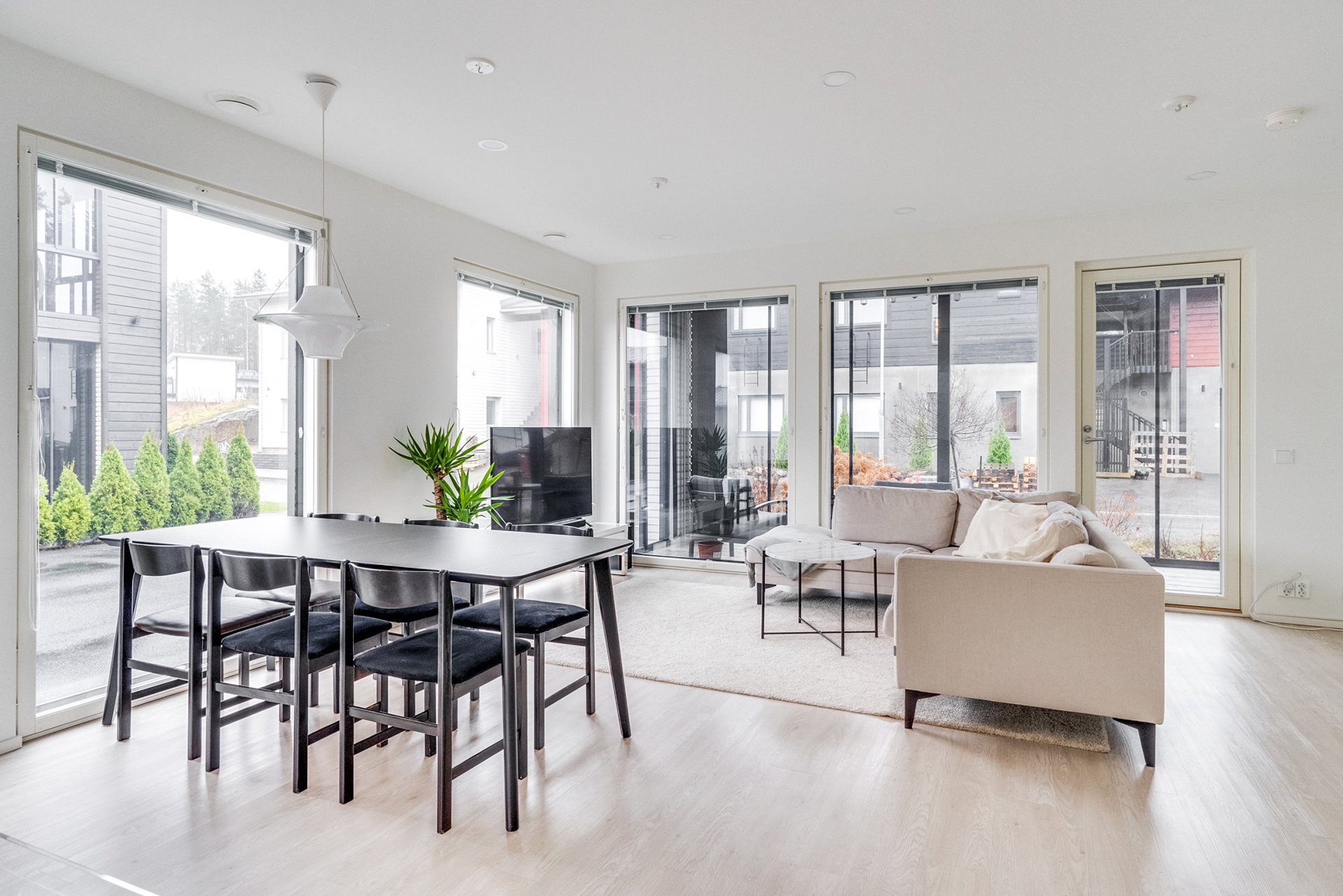 - Olohuoneen suuret ikkunan lisäävät tilantuntua entuudestaan. Olohuoneesta käynti lasitetulle terassille. Lattia: vinyyli Seinät: maali