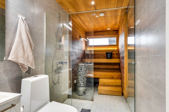 - Saunassa upea lasiseinä. Lattia: laatta Seinät: puu, lasi Sähkökiuas.