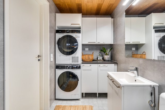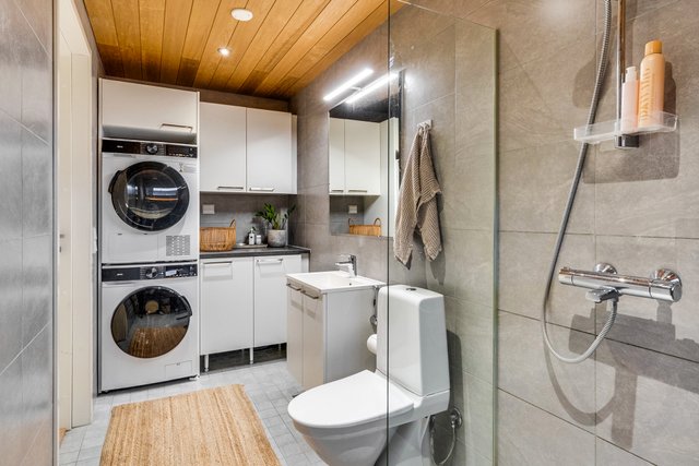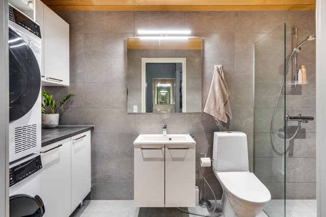 - Kylpyhuoneessa hyvin tilaa kodinhoidolle. Lattia: laatta Seinät: laatta Varustus: suihku, wc-istuin, kaapistot, pesukoneliitäntä, peilikaappi, lattialämmitys, suihkuseinä.