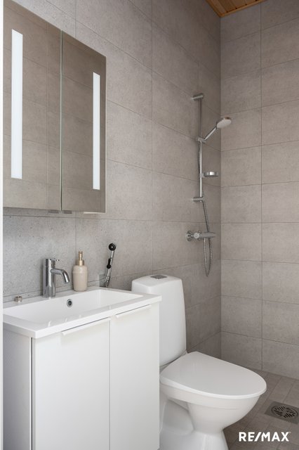- Kodissa kaksi kylpyhuonetta joiden seinät ja lattiat laattaa, wc-istuimet, peilikaapit, altaat, kaapistot, suihkuseinät.