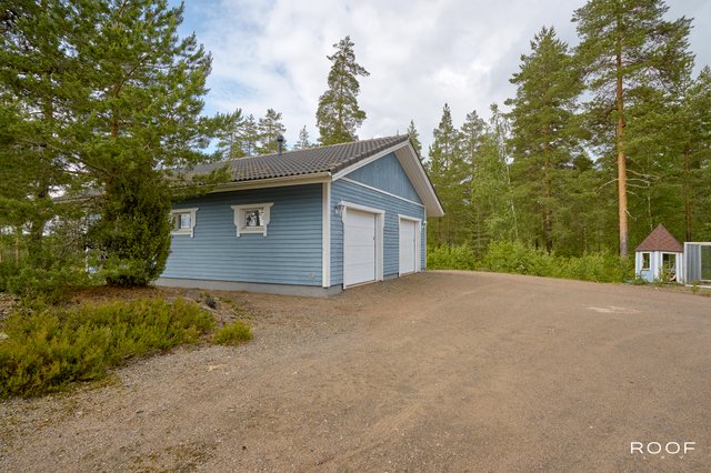 Pihapiiriin kuuluu erillinen rakennus, jossa on kaksi autotallia ja lämmin varasto. Helppohoitoinen piha sulautuu saumattomasti ympäröivään maisemaan - täällä ei tarvitse ruohonleikkuria!