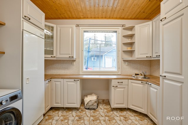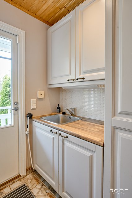 - Pesukoneliitäntä, kuivauskaappi, pesuallas, lattialämmitys, silityspöytä/taso, lattiakaivo, pöytätaso, ja kurapiste