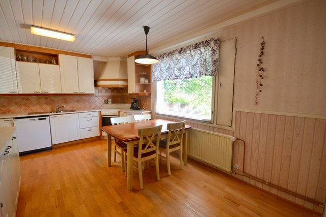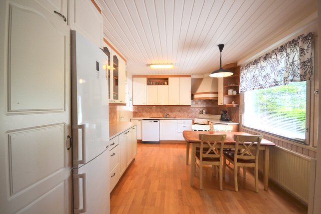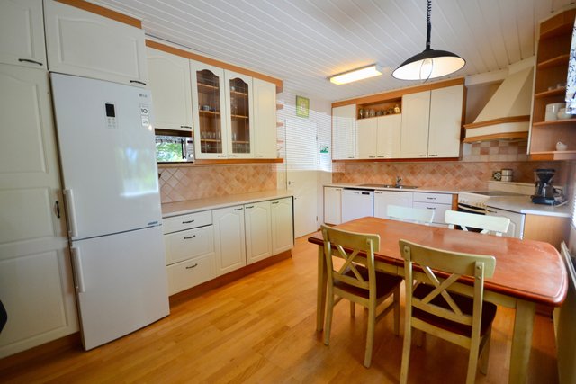 Harmoninen värimaailma toistuu läpi kodin ja avarat tilat pääsevät näin ihanteellisesti oikeuksiinsa. Tilavassa keittiössä viihtyy varmasti perheen kokki ja hulppealla terassilla on nautinto grillailla omassa rauhassa sekä viettää iltaa perheen tai ystävien kanssa. Olohuoneen runsaat tilat on jaettu hienosti kaksipuolisella varaavalla takalla, jonka ääressä viihtyy varmasti pimenevinä syysiltoina. Kodinhoito-ja kylpytilat myös uusittu ja saunassa lempeät löylyt antava puukiuas.