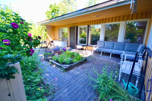 Säilytystilaa on hyvin vaatehuoneen ja kahden varaston myötä. Puutarhassa monivuotisia perennoja, marjapensaita ja kaunista puustoa.