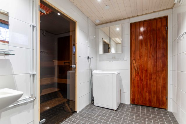 - Suihku, pesukoneliitäntä, lattialämmitys, pesuallas, ja peilikaappi