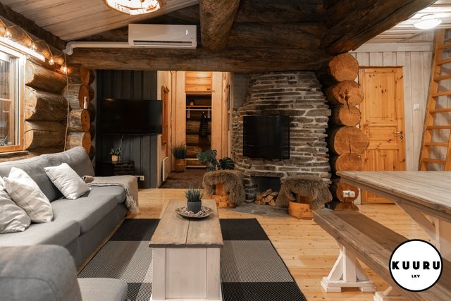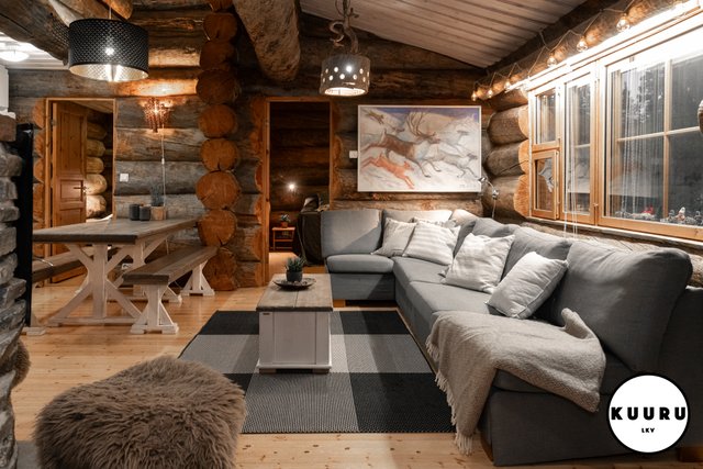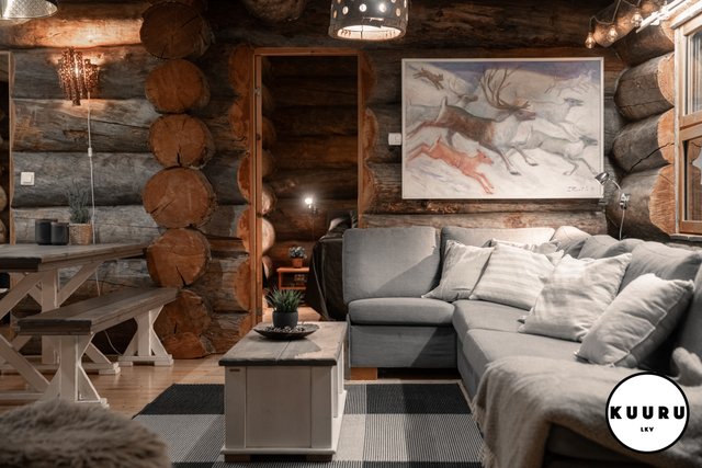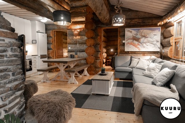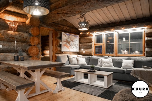 - Olohuone on kodin sydän – tunnelmallinen ja avara tila, joka yhdistyy luontevasti keittiöön ja ruokailutilaan. Upeat keloseinät luovat lämpimän ja kutsuvan tunnelman, jossa viihtyy niin iltaa viettäen kuin rennosti sohvalla löhöillen ja takkatulen loimua katsellen.
