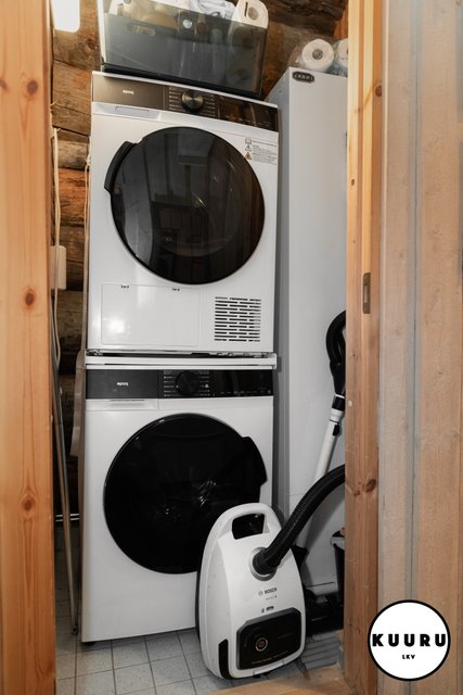 - Eteiskäytävältä löytyy kätevä komerotyyppinen tila, jossa on pesukone ja kuivausrumpu. Ratkaisu pitää kodinhoidon ja vaatehuollon siististi omassa rauhassaan ja tuo arkeen käytännöllisyyttä.