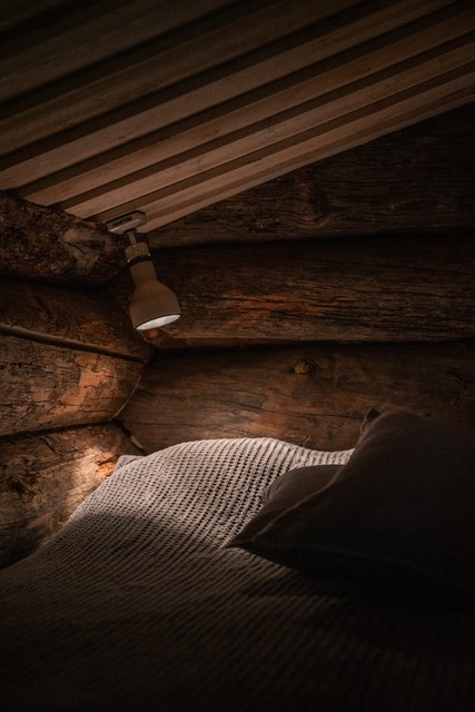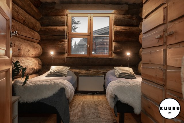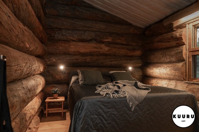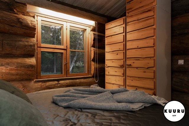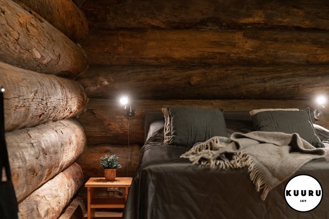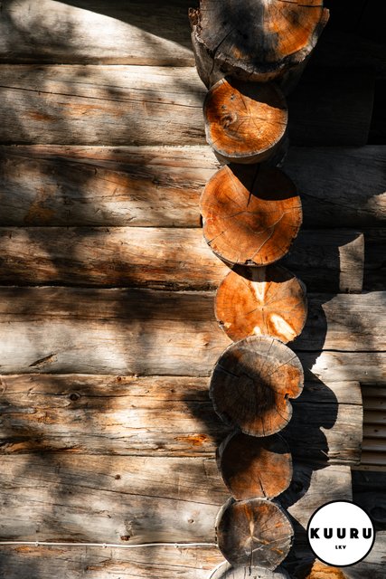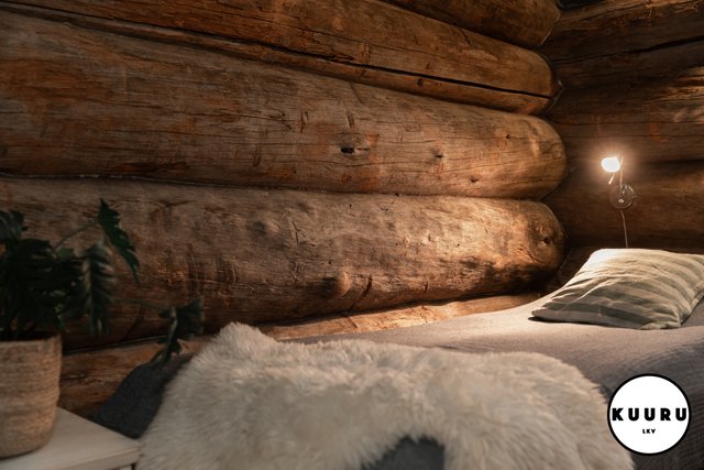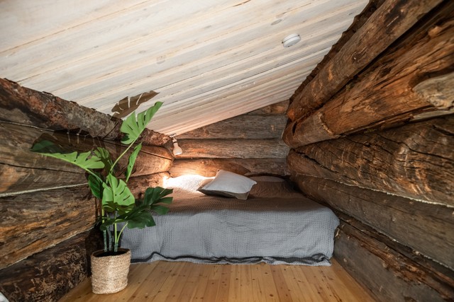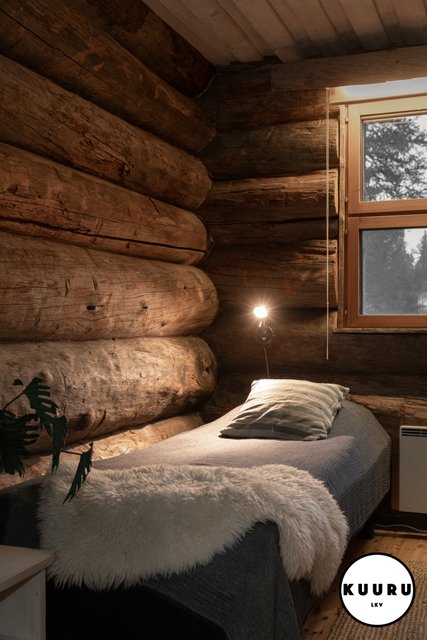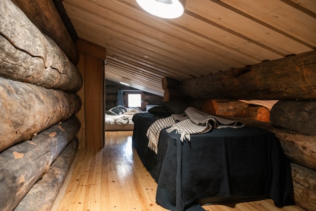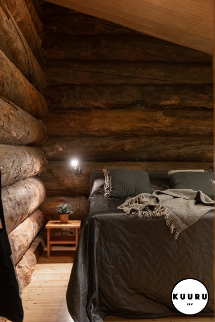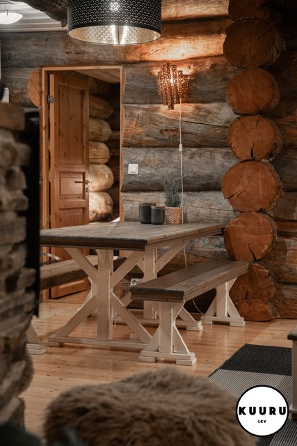 - Seinät pääosin puuta, kelohirttä ja puupaneelia.