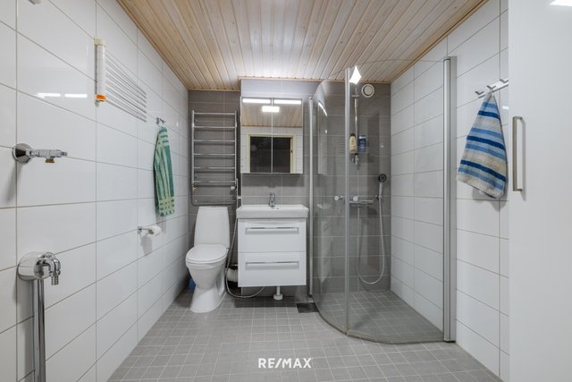 - WC-istuin, suihku, suihkuseinä, pesukoneliitäntä, lattialämmitys, peilikaappi, pesuallas, allaskaappi, ja rättipatteri