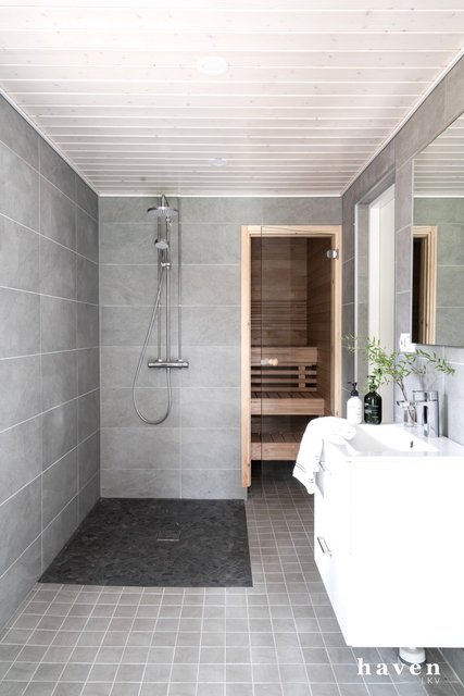- Tilava laatoitettu kylpyhuone lattialämmityksellä. Sadesuihku, allaskaappi, peili, wc, pesukoneliitäntä, ikkuna. Uusittu 2025. Kylpyhuoneesta käynti verannalle ja ulos.