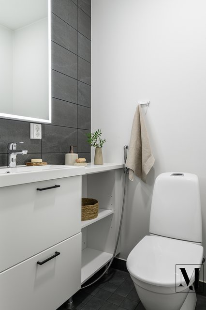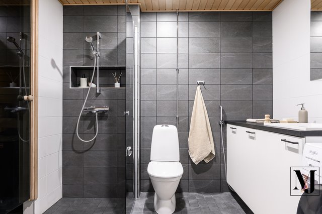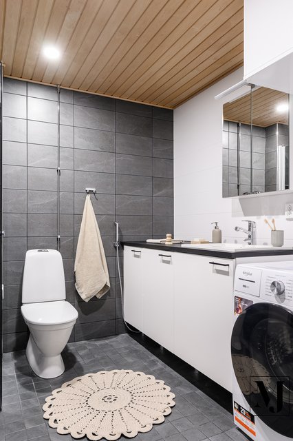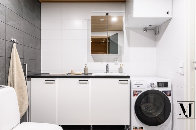 - WC-istuin, suihku, suihkuseinä, pesukoneliitäntä, lattialämmitys, peili, pesuallas, ja allaskaappi