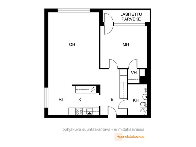 Kodin keittiö ja avara olohuone sijaitsevat vierekkäin, ja niiden väliin sijoittuva ruokailutila kokoaa kodin yhteen luontevaksi ja viihtyisäksi kokonaisuudeksi. Makuuhuoneessa on vaatehuone sekä käynti lasitetulle parvekkeelle, joka tarjoaa mukavan lisähuoneen aikaisesta keväästä pitkälle syksyyn.