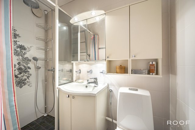 - Suihkuseinä, suihku, wc-istuin, allaskaappi, peilikaappi, pesuallas, ja kuivauspatteri