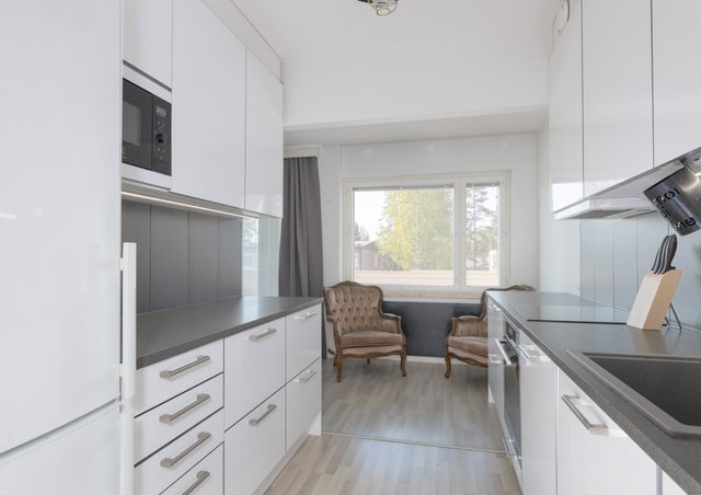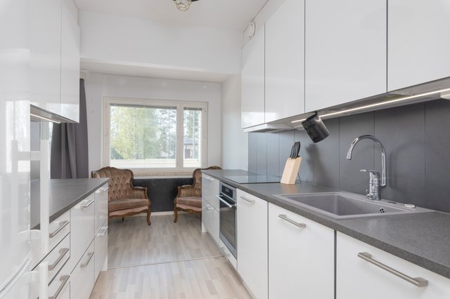 - Varustus: Induktioliesi, Liesituuletin, Uuni, Hana, Kaapisto, Allas, Astianpesukone, Jääkaappipakastin, Integroitu mikroaaltouuni Lisätietoa: Kattovalaistuksen (paikan) lisäksi yläkaappien alla ledi valaistus ja runsaasti pistoke paikkoja yhteensä 8kpl jos kodinkoneille varattuja ei lasketa mukaan. Vedettävä jätevaunu altaan alla. Uunissa on höyrytoiminto ja ruoanlaitossa avustavat ohjelmat. Seinämateriaali: Maali Lattiamateriaali: Laminaatti